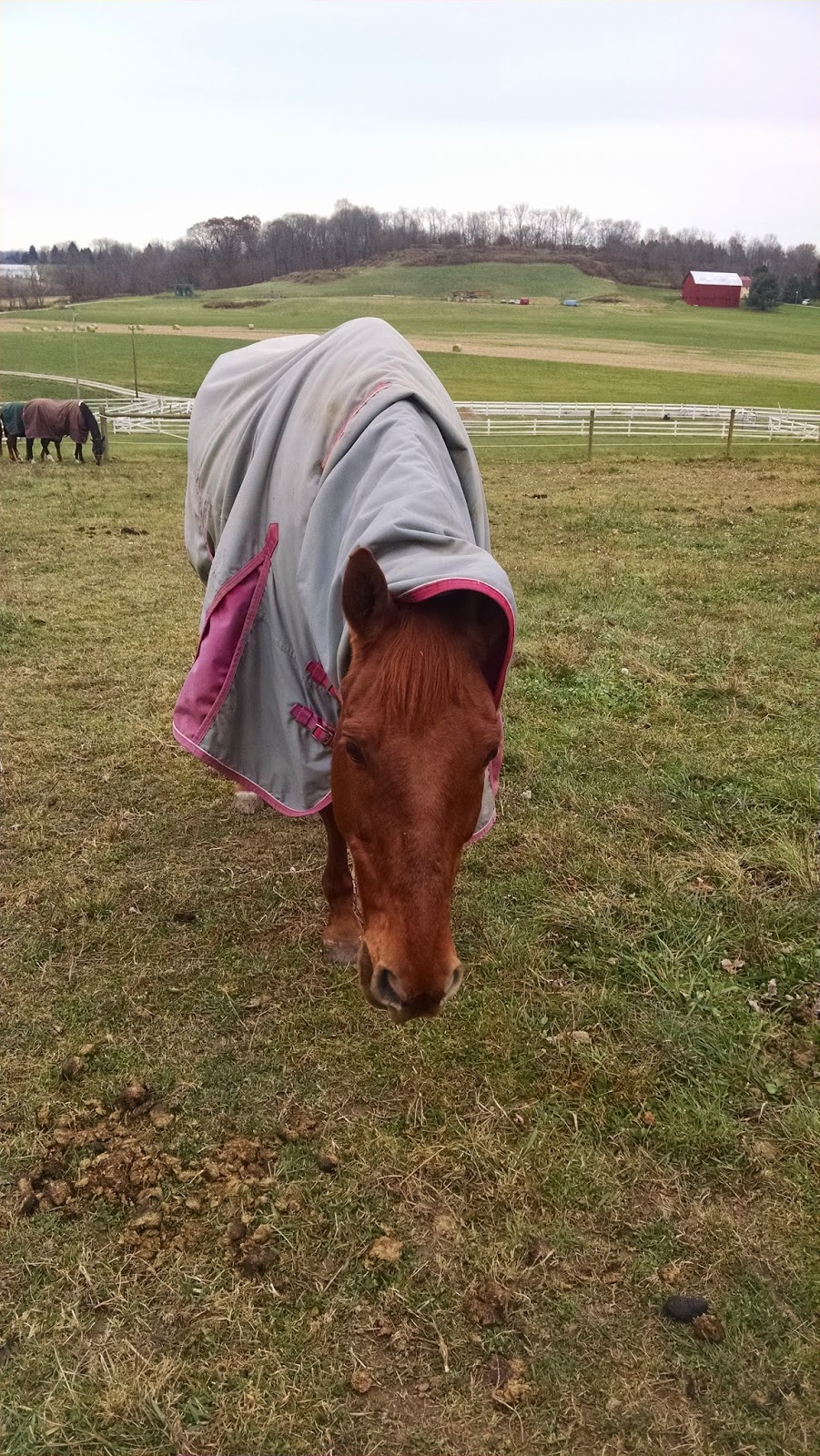 I came out for morning feed and stalls on Sunday as I will be taking over AM work on Sat and Sun while Mikey is at this barn. I took Mikey out to walk around and explore the fields by himself before he met the other horses. Its very windy at this barn, so I stuck him in his hooded clothes.